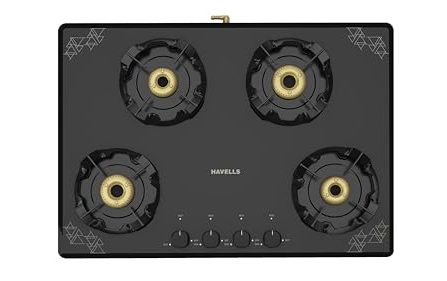 Unknown Binding Havells Nucleus Slim Gas stove |4 Heavy Duty Forged Brass Burner|8 mm Toughened Glass|Premium Valves|Removable Drip Tray|Soft Touch Knobs|5 year Warranty on Burners, Glass & Valves by Havells (Black)